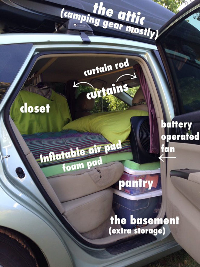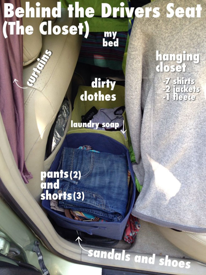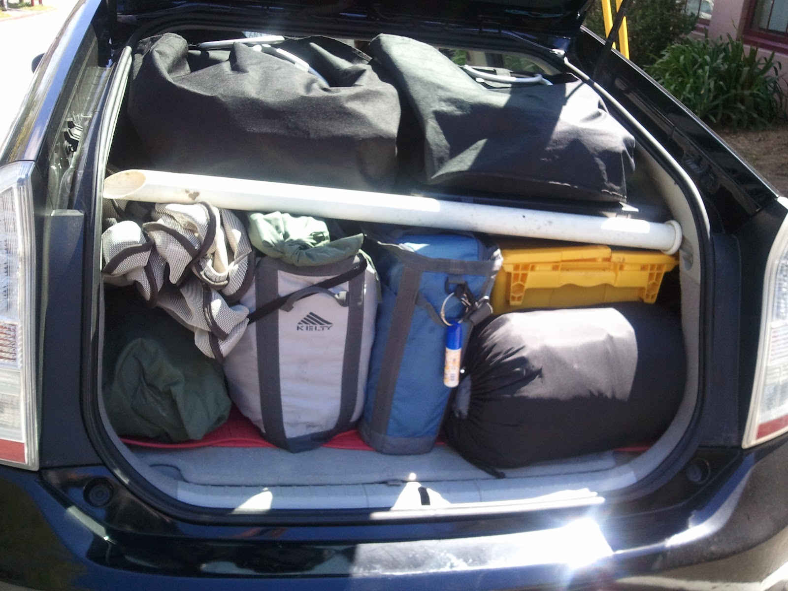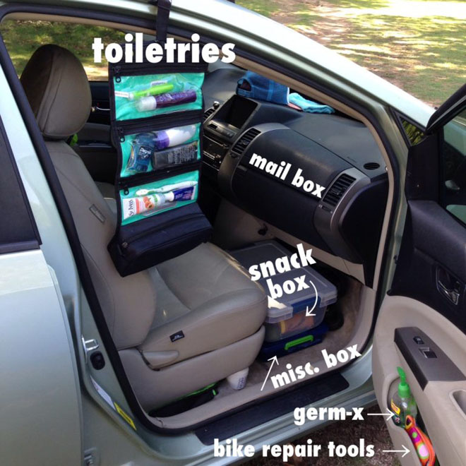 If the inside of the Prius is for sleeping, and the outside of the Prius is for everything else, you don’t need much. The library and Starbucks can be your living room / office. The the gym can be your bath room. The the microwave at the grocery store deli can be your kitchen. Remember that the world is your oyster. Go live in it!