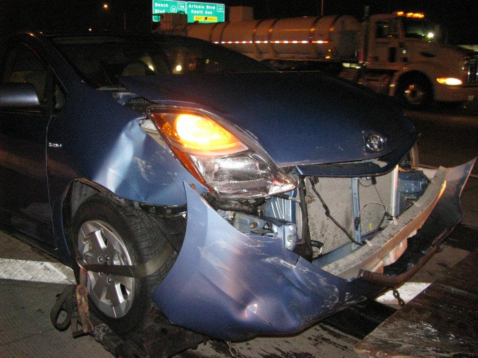 I was traveling on I-5 through Orange county when a young man in a Honda Acura decided it would be a good idea to speed over 100mph while the rest of us were going 65mph on a busy highway. Unfortunately, this situation caused several vehicles to lose control and crash into each other. One of the vehicles in question was a large SUV, that somehow started traveling in a direction perpendicular to the highway, crossing in front of me horizontally and hitting the front corner of my car (passenger side).