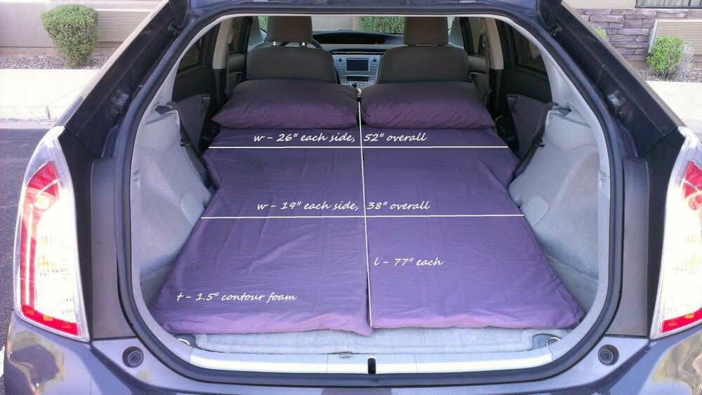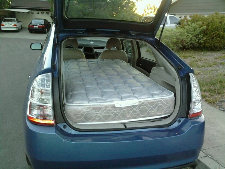 First a confession, the Prius really isn’t tiny! LOL Yes, it’s smaller than an RV, any RV, but that doesn’t mean you have to be cramped. The back seats in a Prius fold completely flat, and there is more than six feet from the front seats to the hatch, so unless you’re a basketball player, there’s plenty of length. The GenII Prius was long enough to fit a twin mattress with a few inches to spare. The GenIII is even longer.
