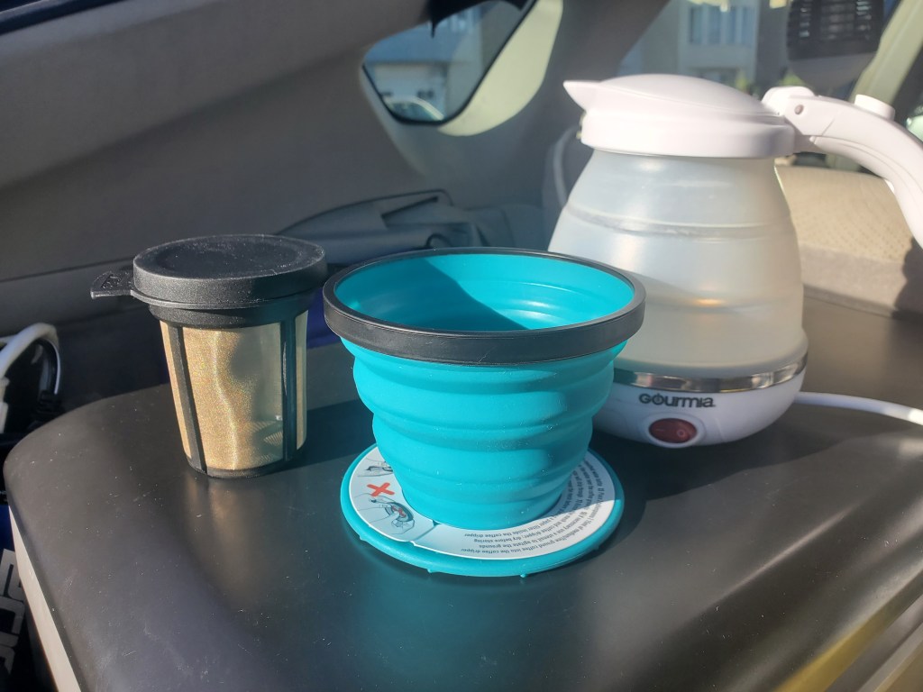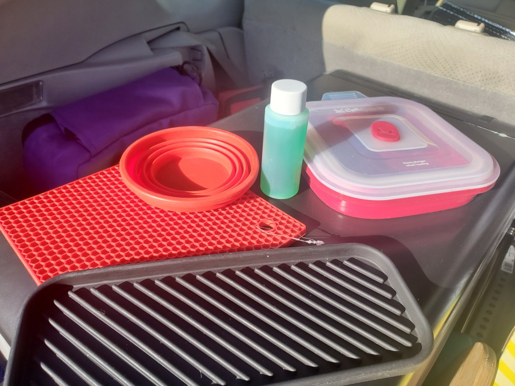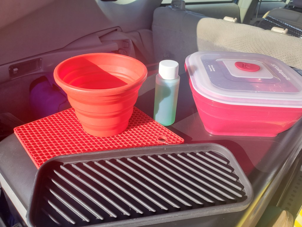 Inside my collapsible kitchen sink, I can fit an 8″ electric skillet, a collapsible pot, a waffle maker, a collapsible food container, collapsible cups, a trivet, a silverware drainer, and dish soap. The collapsible cups are great for washing small items, or brushing teeth. In this age of Covid-19, I wash my hands all the time, so having soap, water and a mini-sink is incredibly useful!