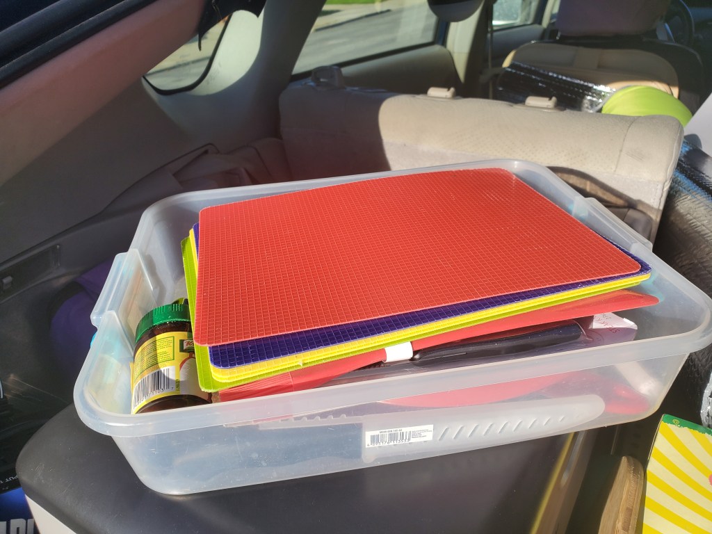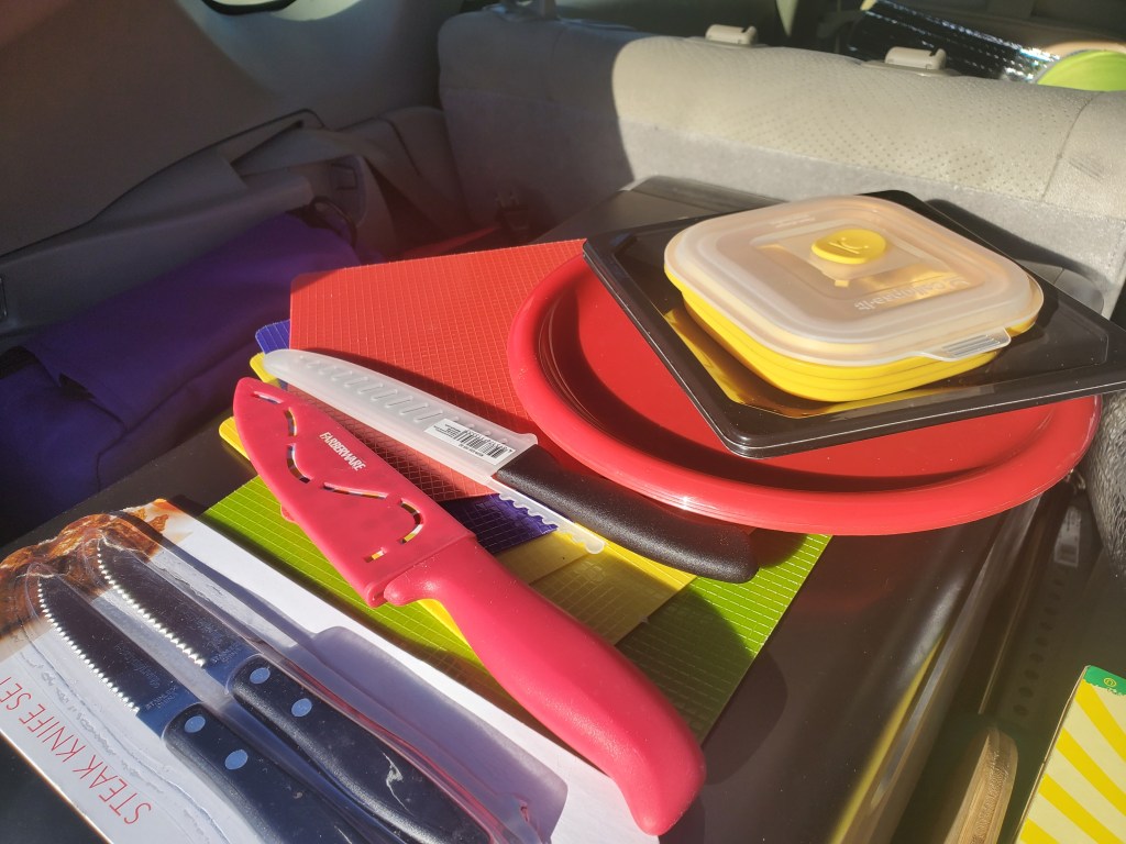The small box I keep under the kitchen sink stores several cutting boards, plates, cooking knives, and another collapsible food container. If there’s no table or you need a clean spot to put something, the cutting boards work great and can even be used as plates!