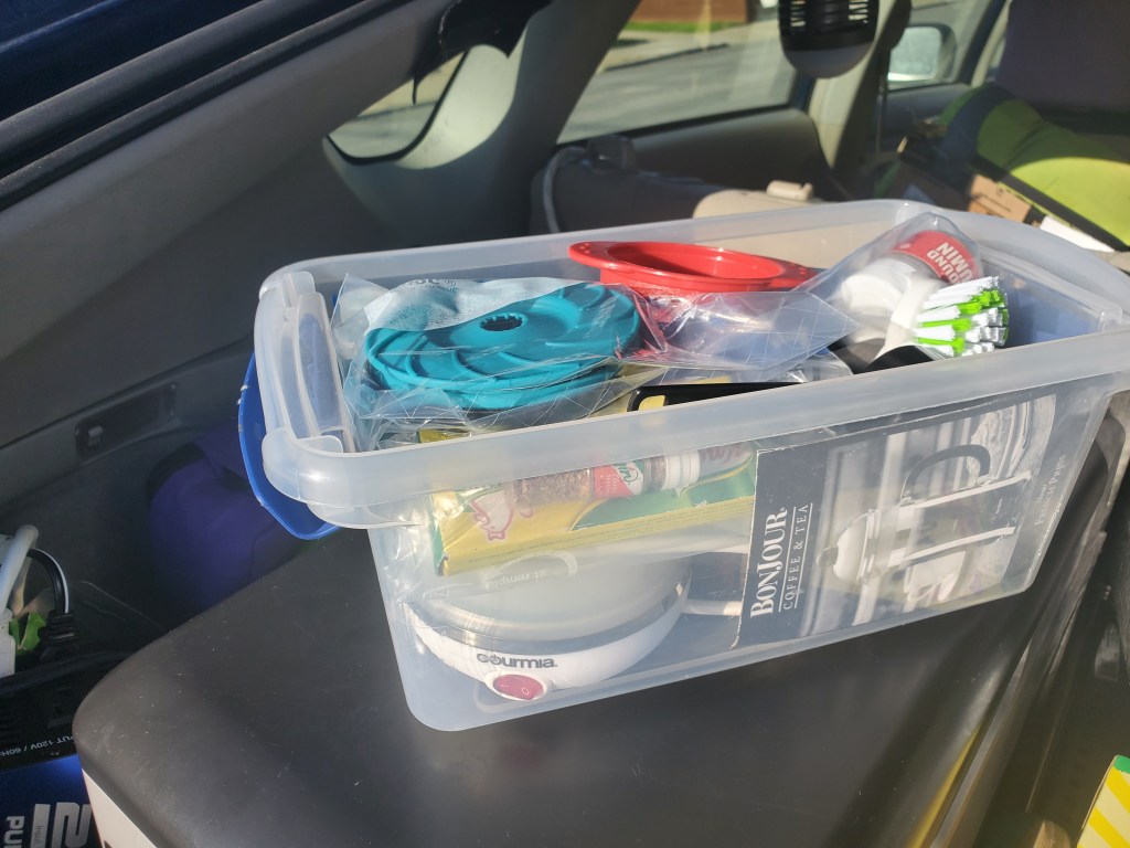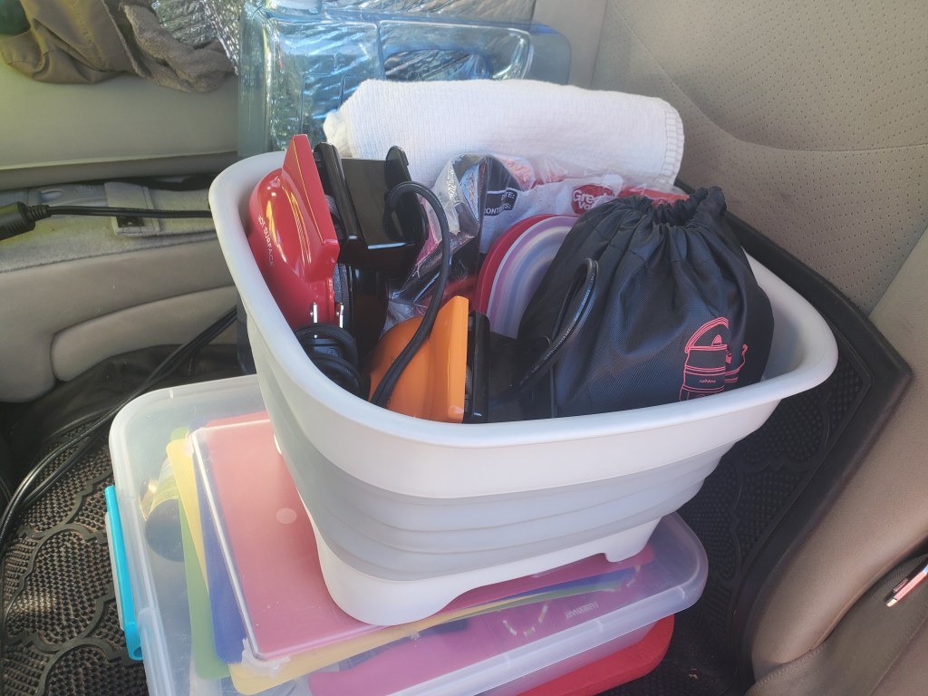 I’ve always heard that expression, “everything but the kitchen sink” when referring to people who pack lots of stuff for a trip, but if you’re going to travel in a Prius, everything needs to be small, and you need a good way to pack it. So for those of us living Priuslife or Vanlife, why not pack everything inside the kitchen sink? Yes, you can achieve most of this goal with small, collapsible items, a collapsible sink, and a couple small boxes.
