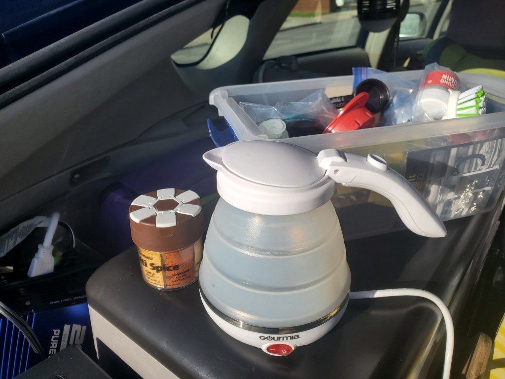 My last box is a plastic shoe box that fits my collapsible kettle, spices, coffee and tea accessories, matches, and every other tiny cooking item I need. Recently I discovered that I needed a small strainer for pasta because the holes in the strainer that came with my hot pot are too large. I settled for a tuna can strainer because it’s small enough to fit in my little box perfectly!