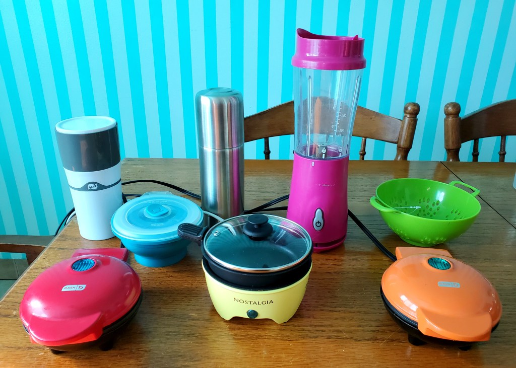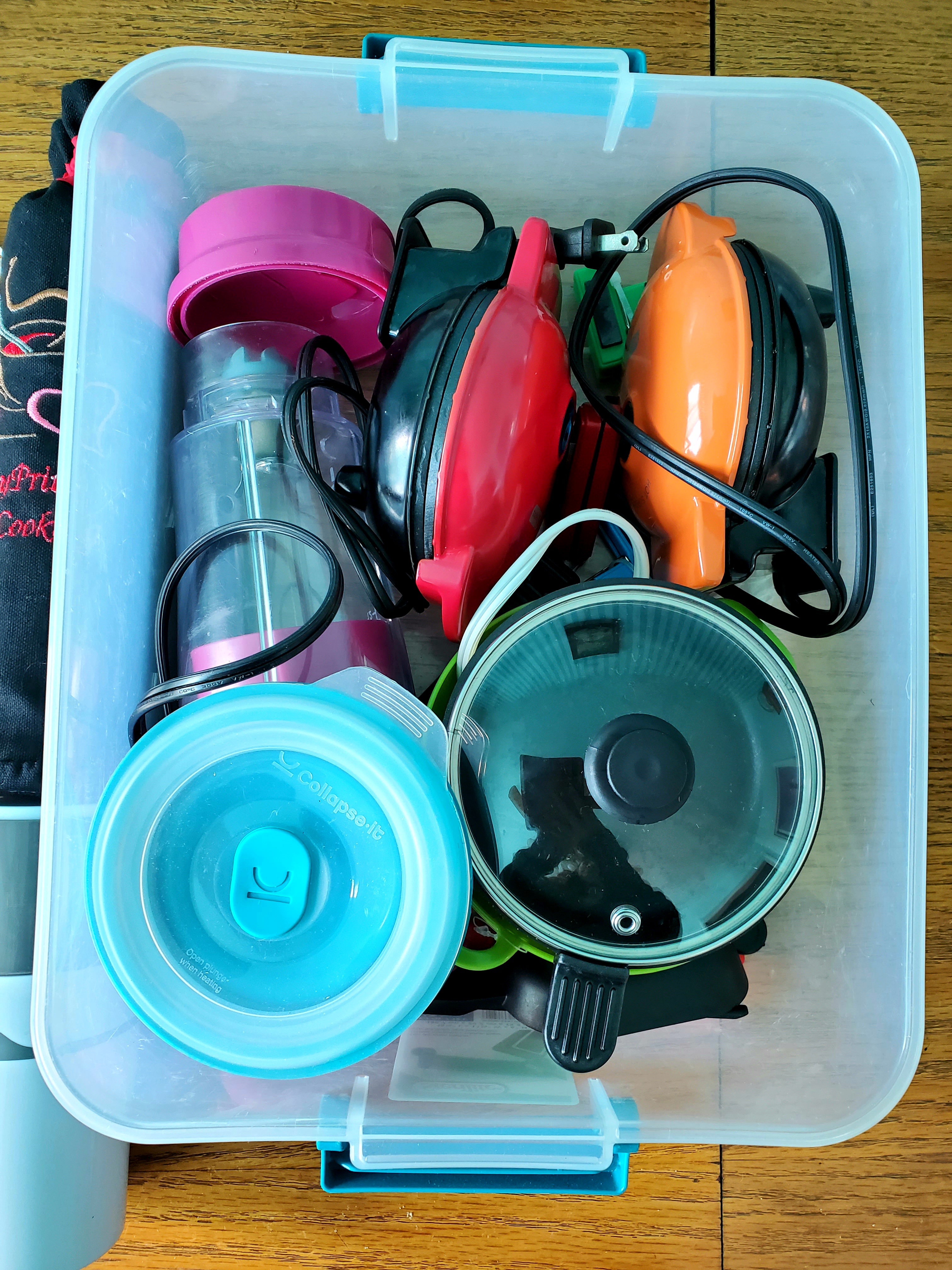 I started out with an instant pot, toaster, electric skillet, and kettle. I even took an air fryer on my travels for a while! And though I love all those items, I’ve replaced all of them with smaller items, so that almost everything fits in one small plastic bin. With just these items I can grill, make waffles, pan fry, heat soup, make coffee and blend drinks!