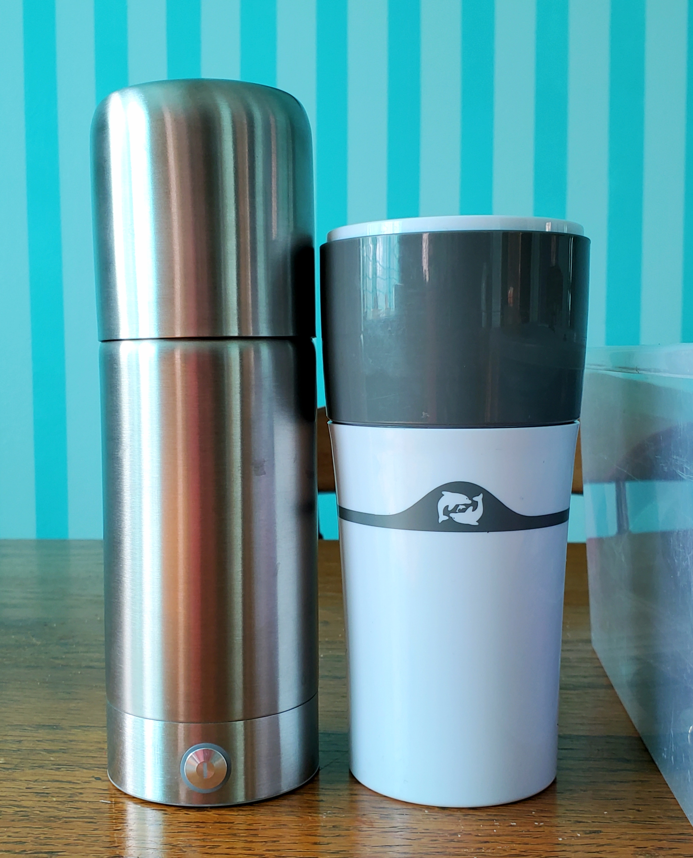 When I want to boil a larger amount of water quickly, for guests or washing dishes, I have a collapsible 700w kettle that boils 2 cups of water in about 4 minutes. The higher wattage kettle requires use of my larger, 720Wh Ecoflo power bank, which I also use as backup power for my fridge when my car is off. The Loutytuo kettle is pretty compact and comes in a sturdy travel case.